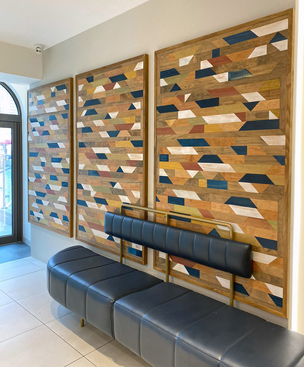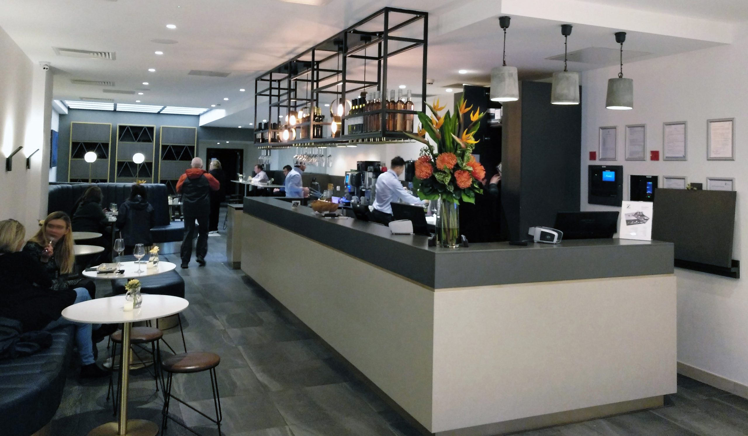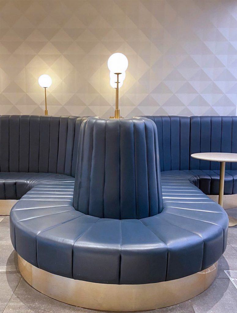 El diseño del Café practica la “armonía por contraste” para generar capas y niveles de profundidad en un espacio muy definido. Utilizando solo dos materiales, Nymbus & Cemento, para las encimeras, las mesas y el suelo, se crea un fondo secundario en esta nueva etapa donde la banqueta azul ondulante se convierte en el protagonista principal del espectáculo. Por lo tanto, los muebles y las luces son las características principales de este Café, las superficies en todo el café se han mantenido simples.