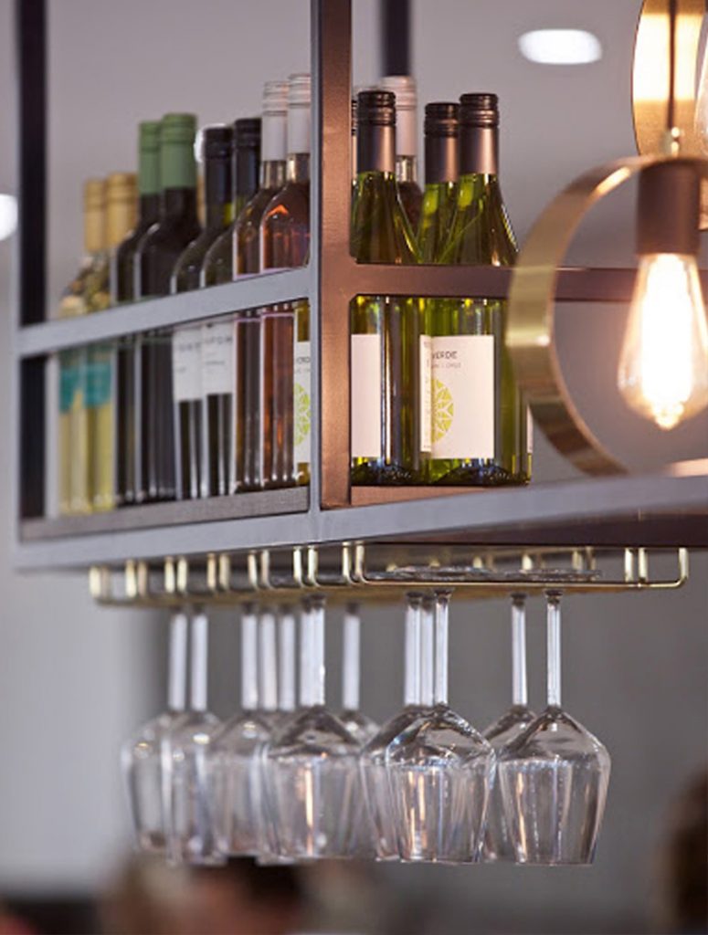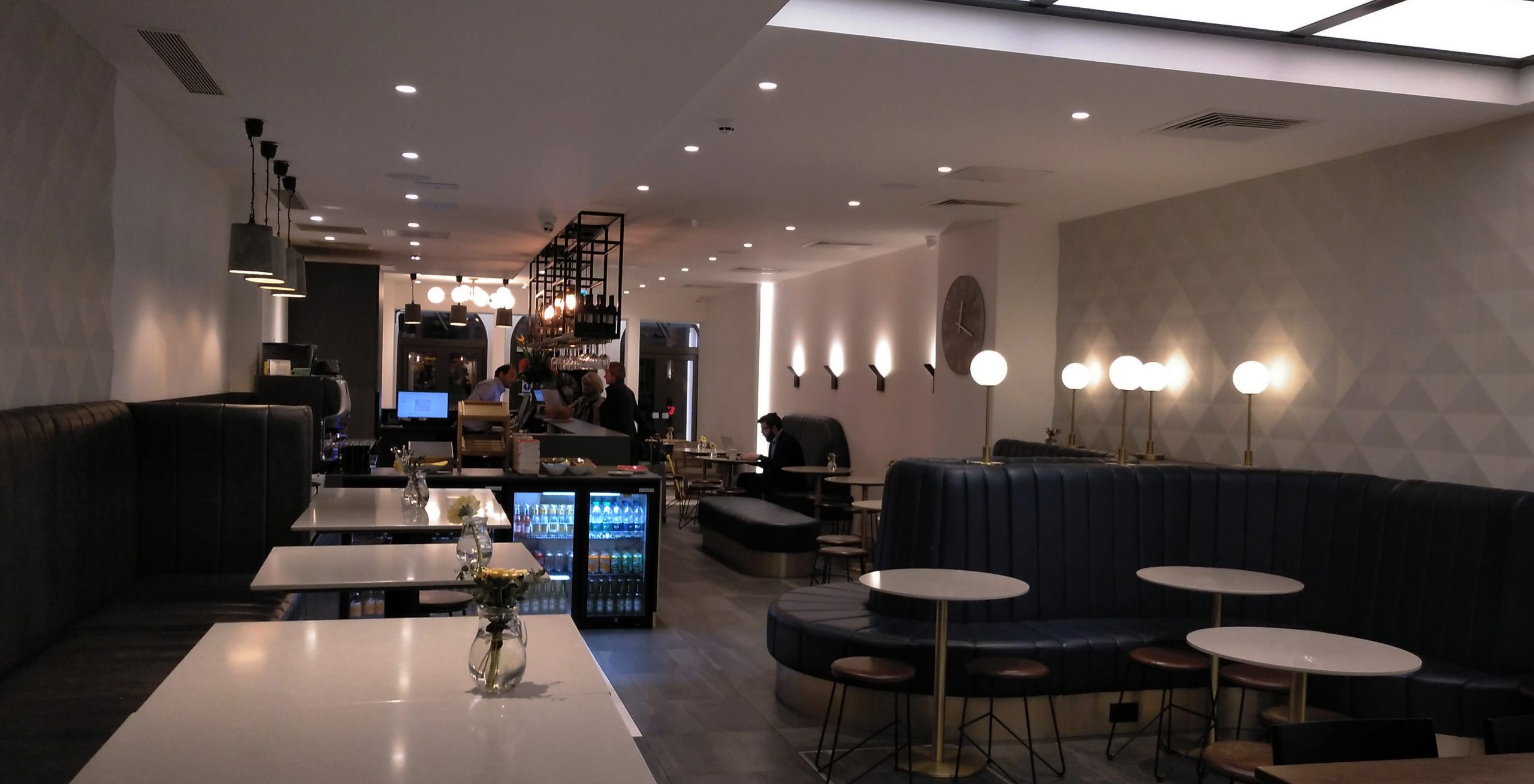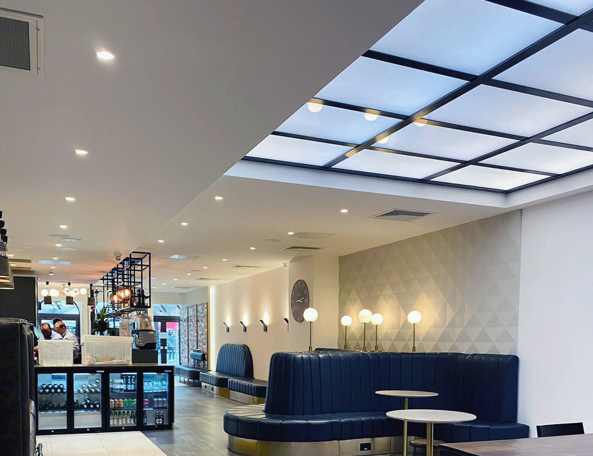 All the furniture pieces were designed in the office and made in England with local craftsmen and suppliers. The big luminaire, on top of the communal table, was designed by us and the contractor to bring a natural light effect in the interior of the Café.