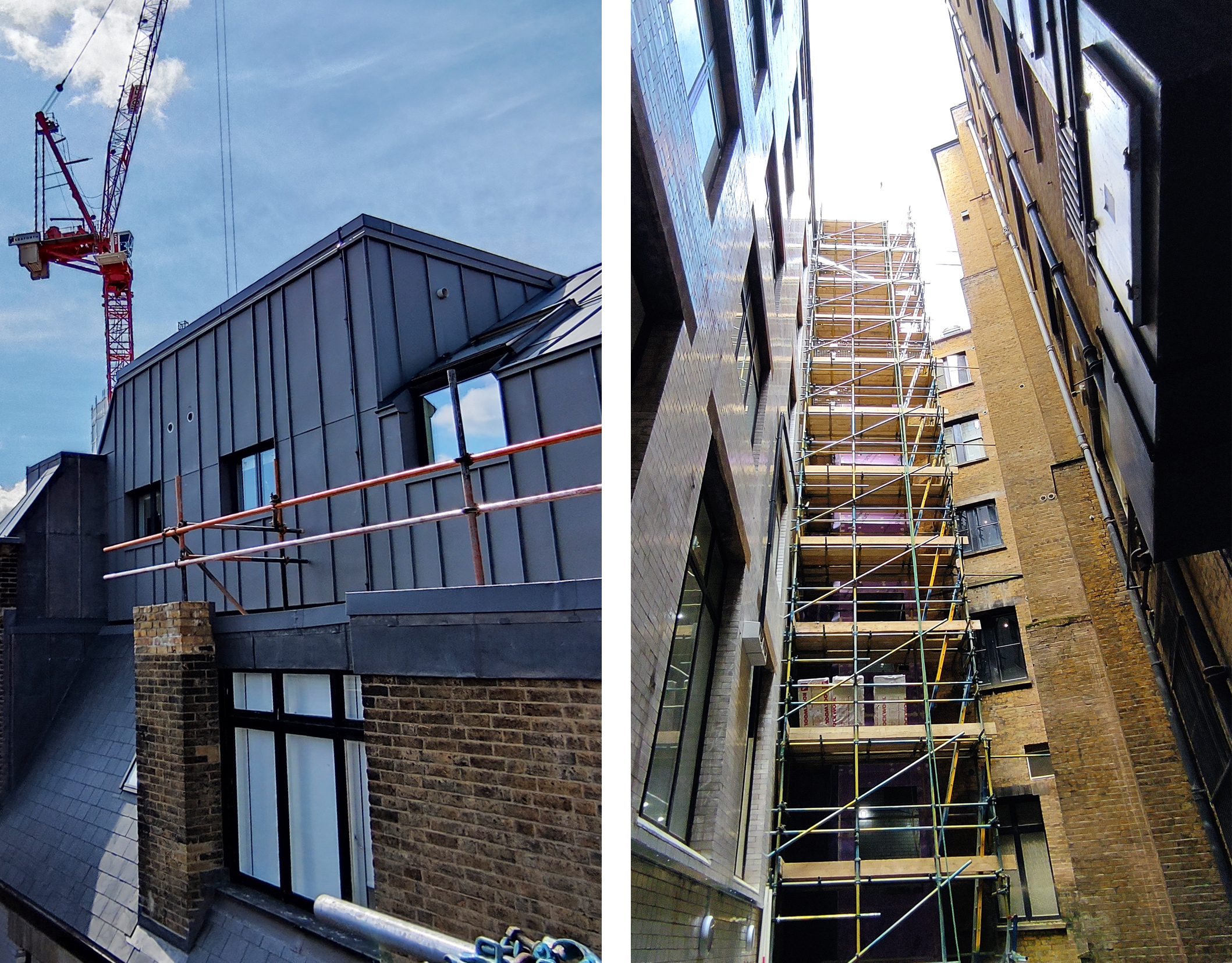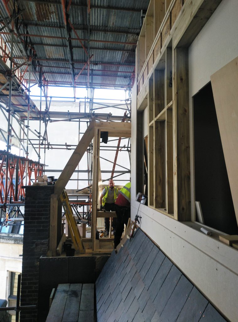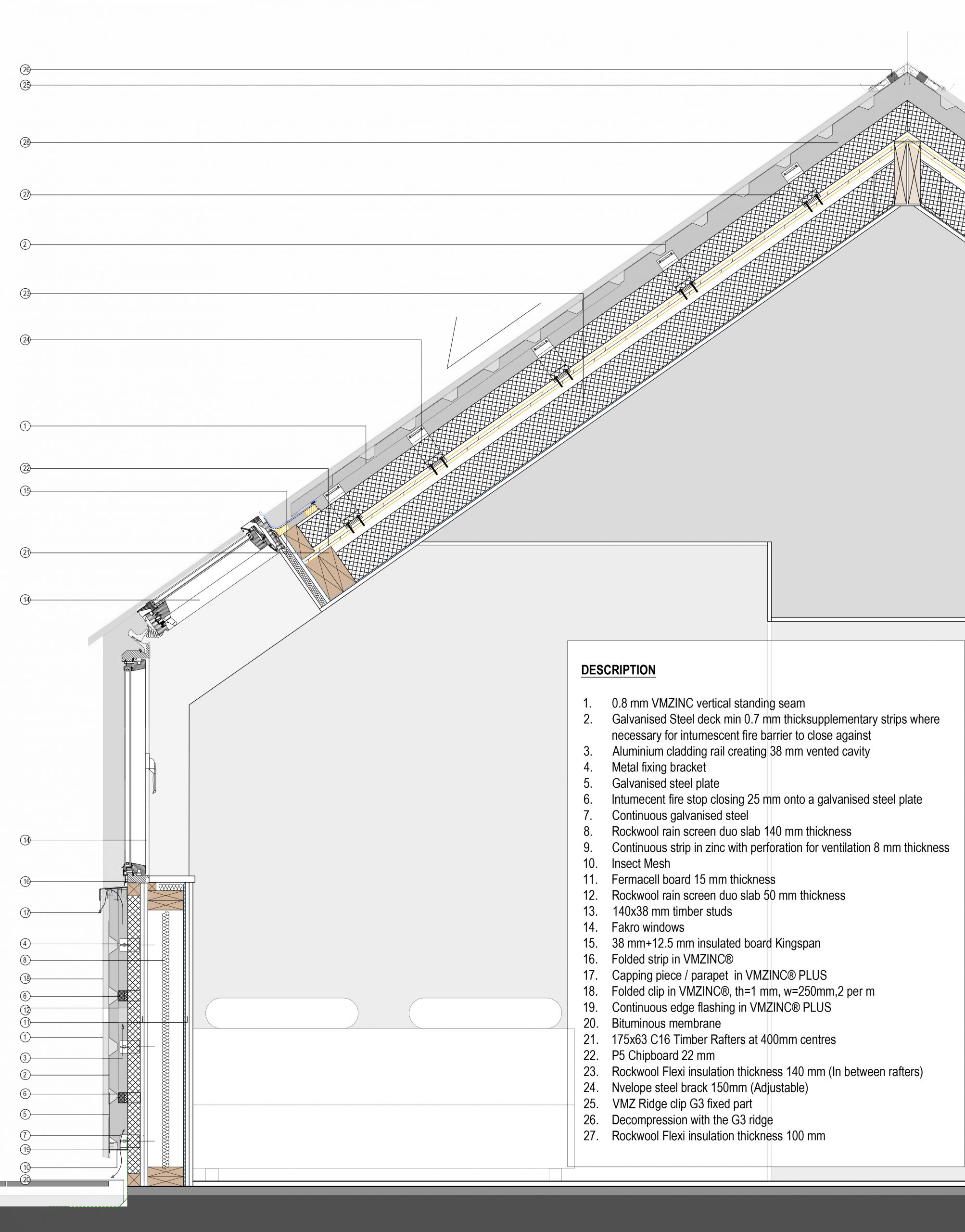The seventh-floor extension is constructed with just one type of timber studs, 140 x 38 mm, and Fermacell boards. The façade is comprised of vertical standing seam zinc which is also used to cover the new roof.