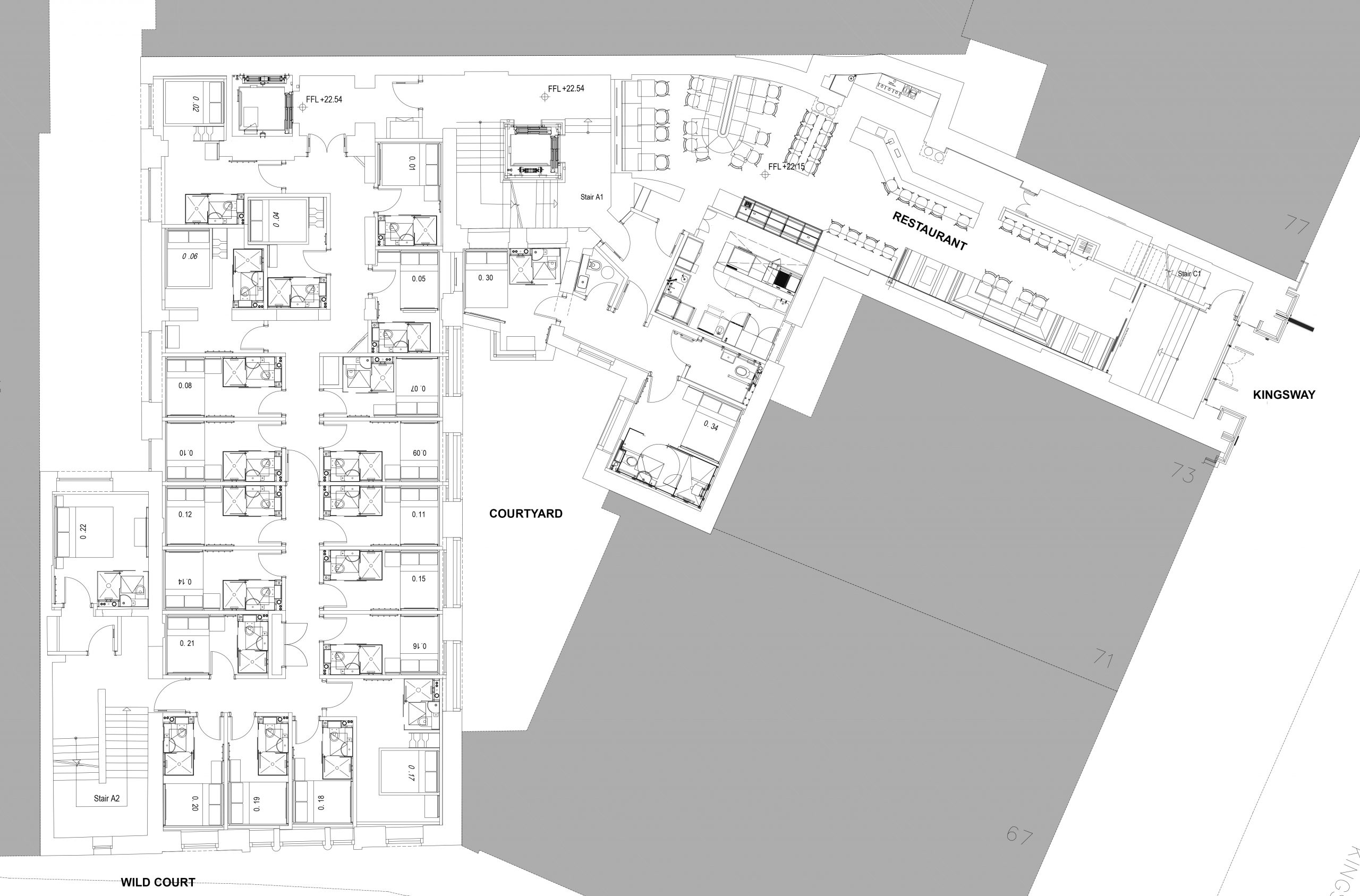 El edificio que se sitúa en Wild Court se transforma en su totalidad en un hotel, mientras que la edificación que está en Kingsway, solo verá transformada su mezanine y planta baja, donde se localiza la entrada principal al complejo.