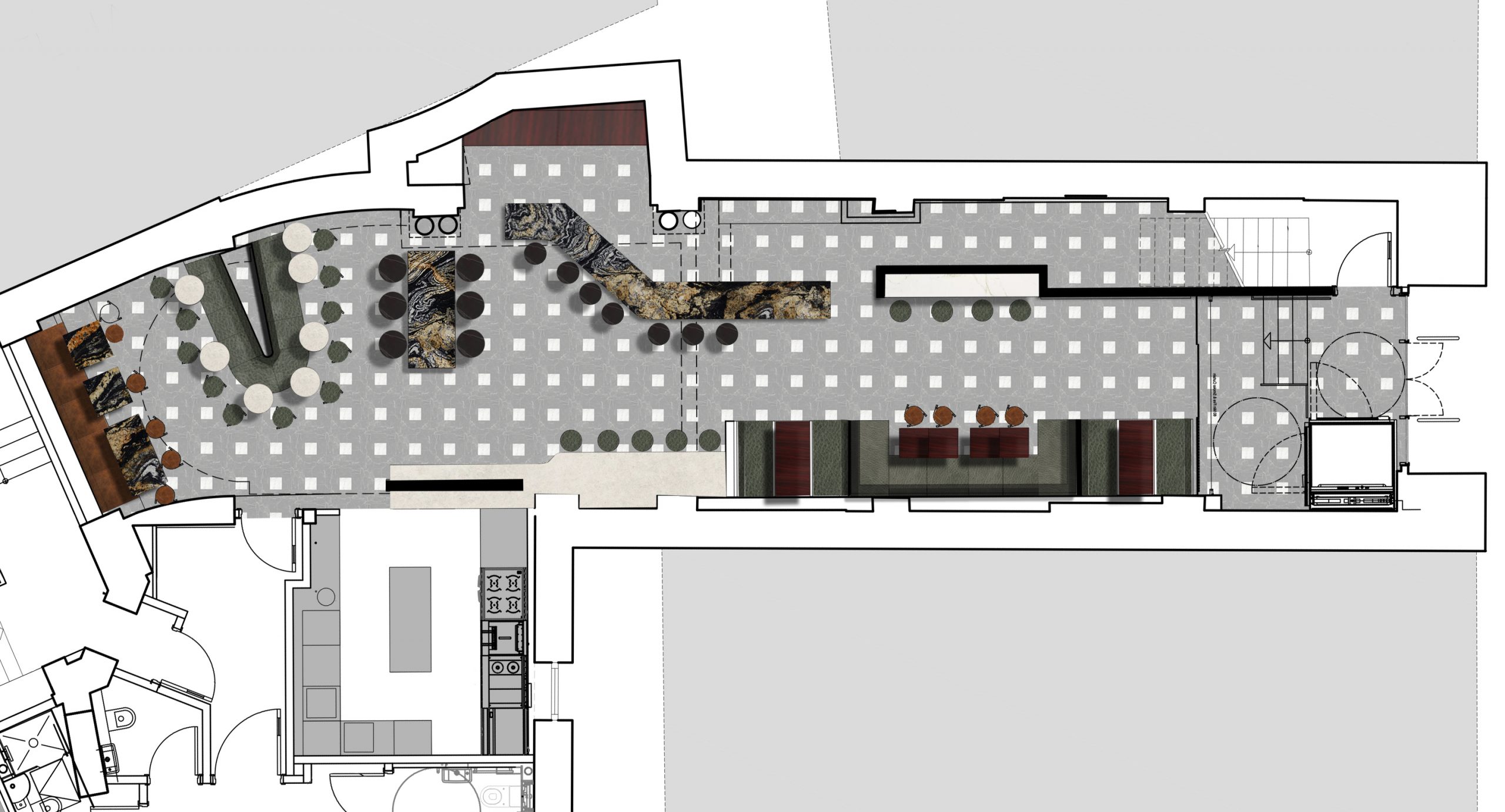 Kingsway Rumble project re-established the original layout of the Kingsway Hall theatre´s former lobby built in the 1910s, which had subsequently been divided unsympathetically. We then reconfigured the space to incorporate a new restaurant, hotel reception and entrance.